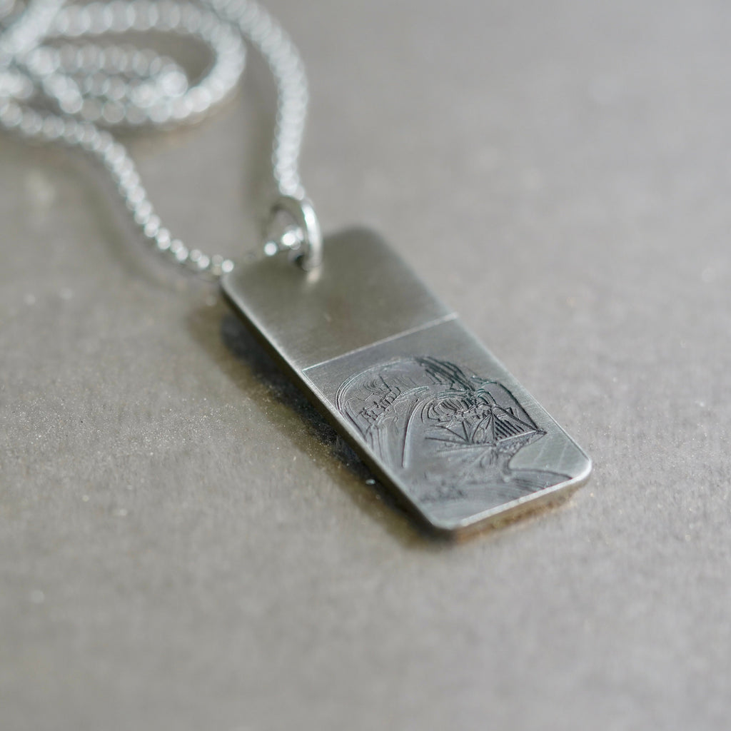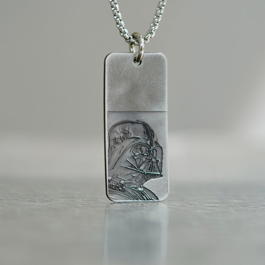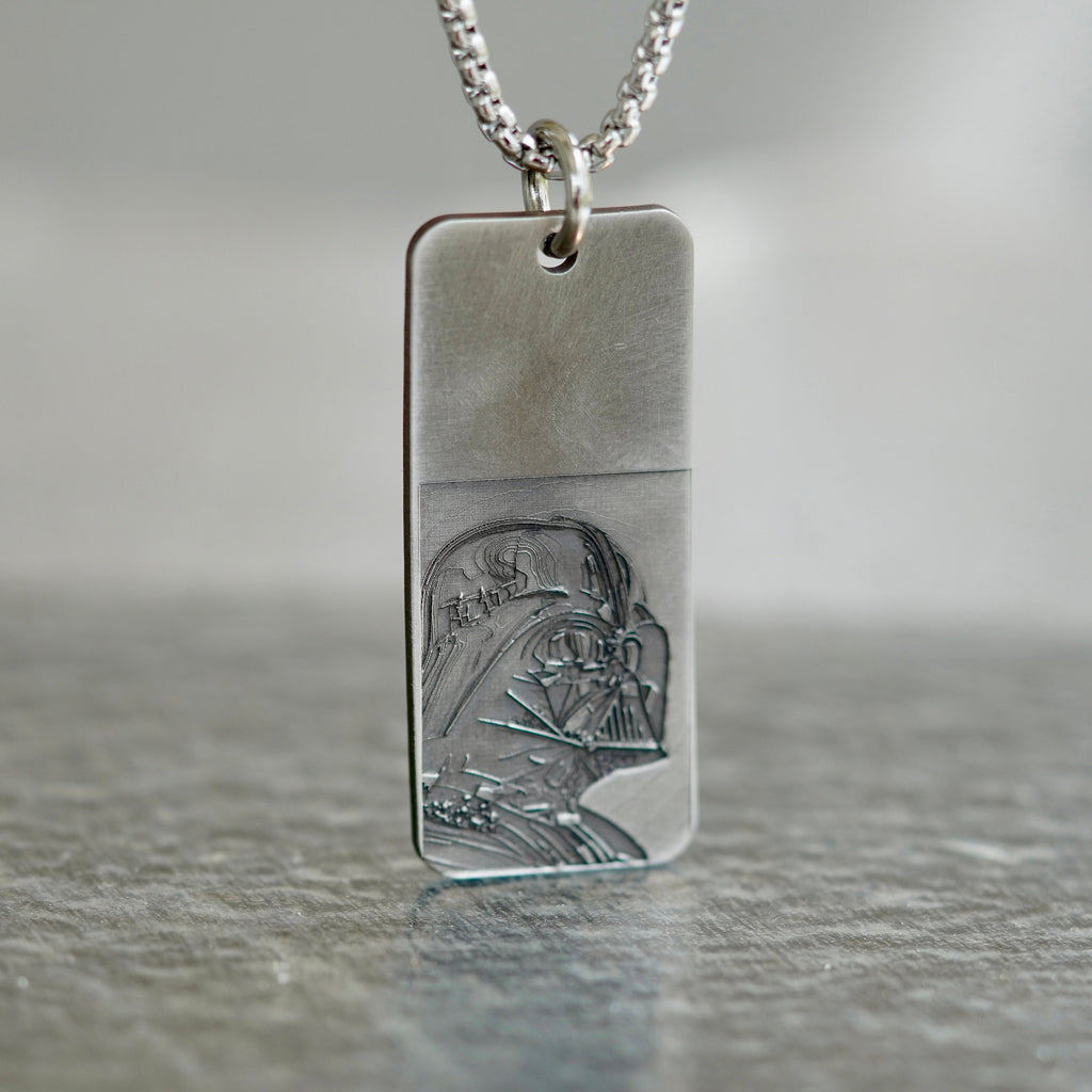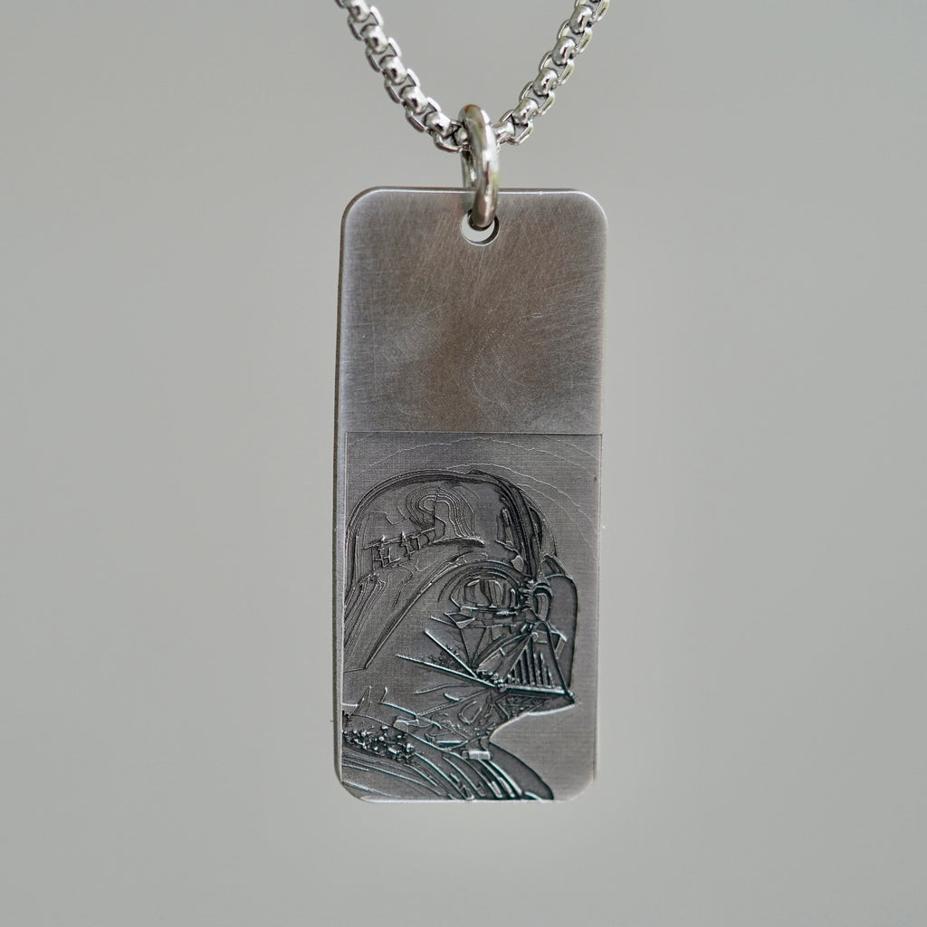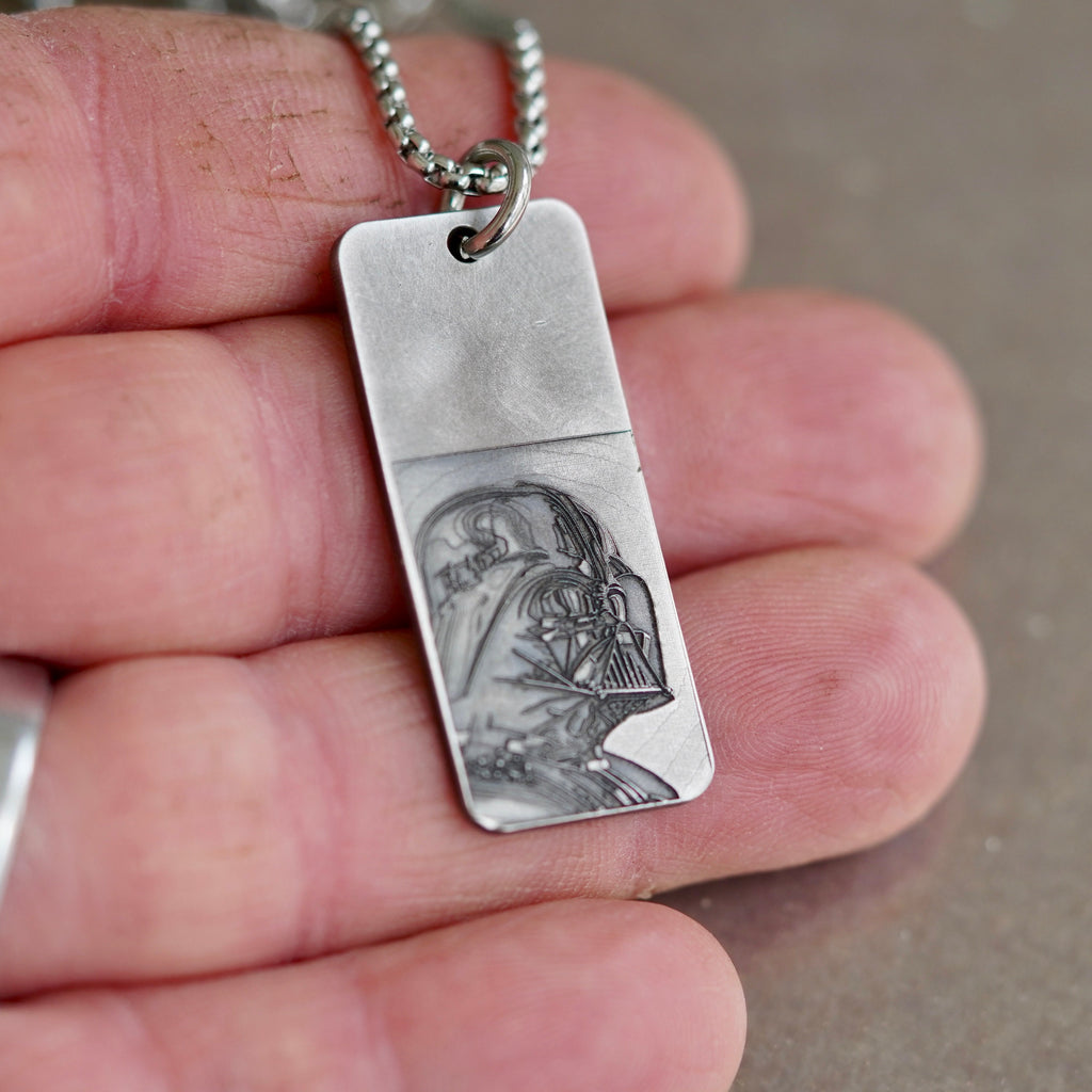 Darth Vader Necklace, Star Wars fans can add a touch of dark elegance to their everyday look with the Darth Vader Half Helmet Pendant design. we made this using our water jet and laser engraver soon it will be available in sterling silver and Gold