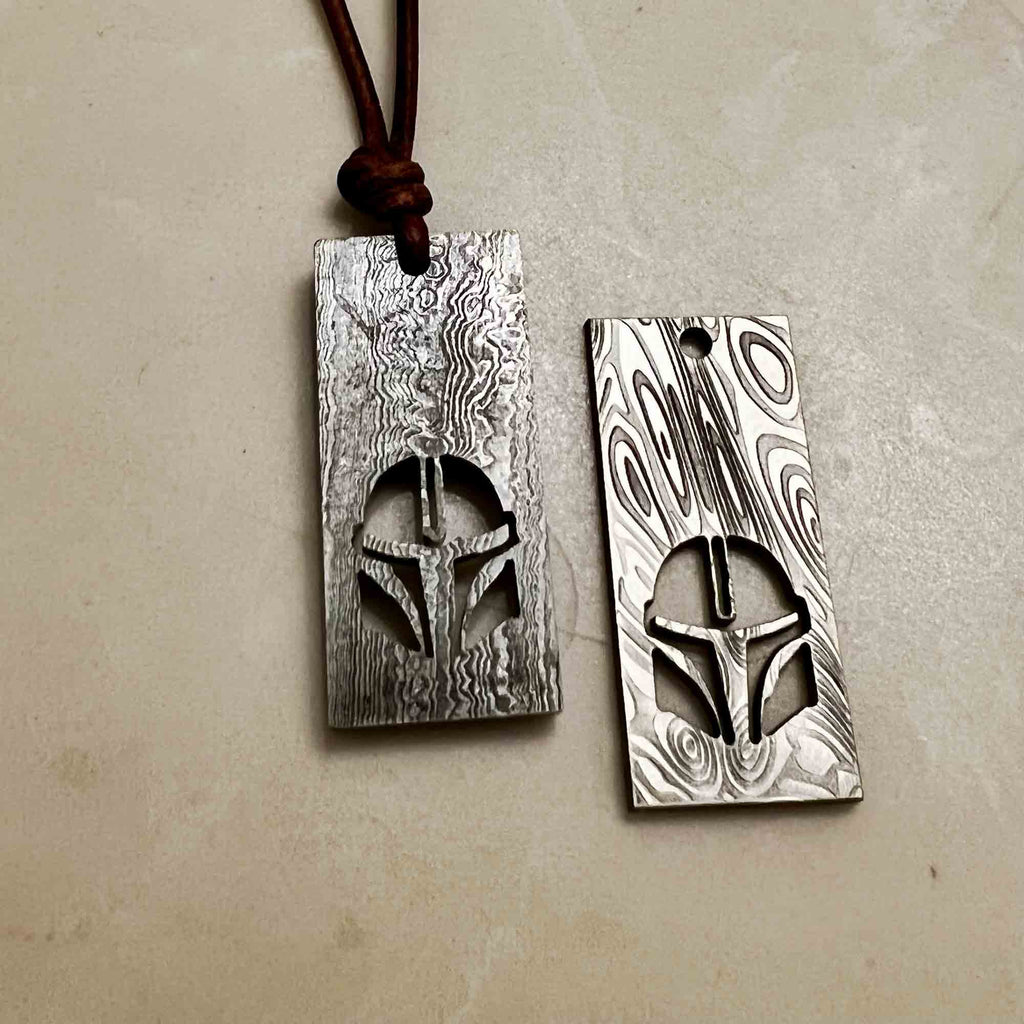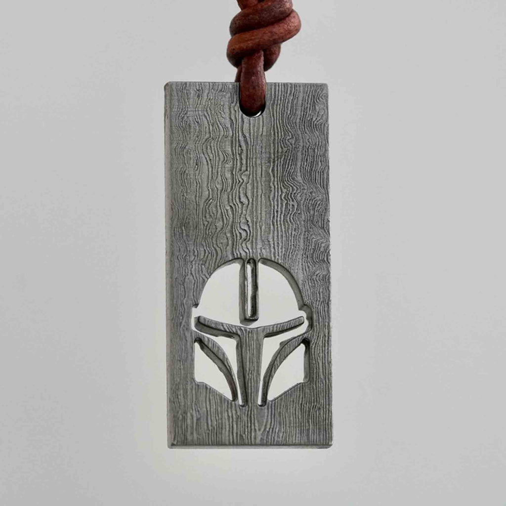Check out our rustic-style Mandalorian helmet necklace, a great gift for any Star Wars fan eagerly anticipating the third season of The Mandalorian. This one-of-a-kind necklace features a 3/16-inch thick Damascus steel silhouette on a stainless steel chain.