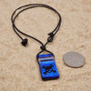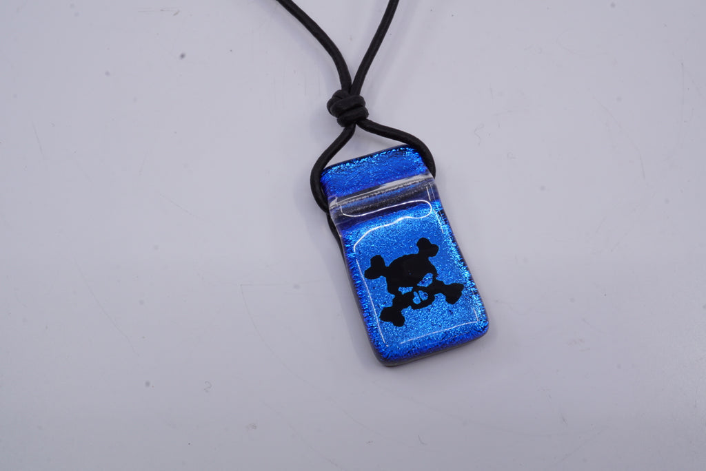 Timeless skull Necklace Handmade from Blue color Fused Dichroic Glass. The pendant is set with a 1.5 mm greek black leather cord.