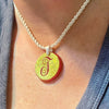 The New Monogram necklace Style initial necklace made of Gold color Dichroic Glass fused on Red color Base. 1 letter pendant.