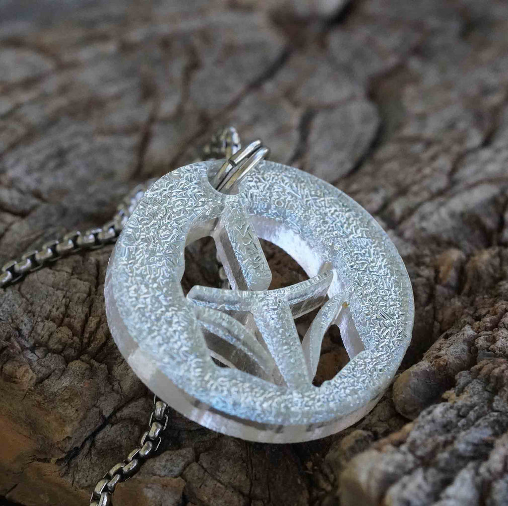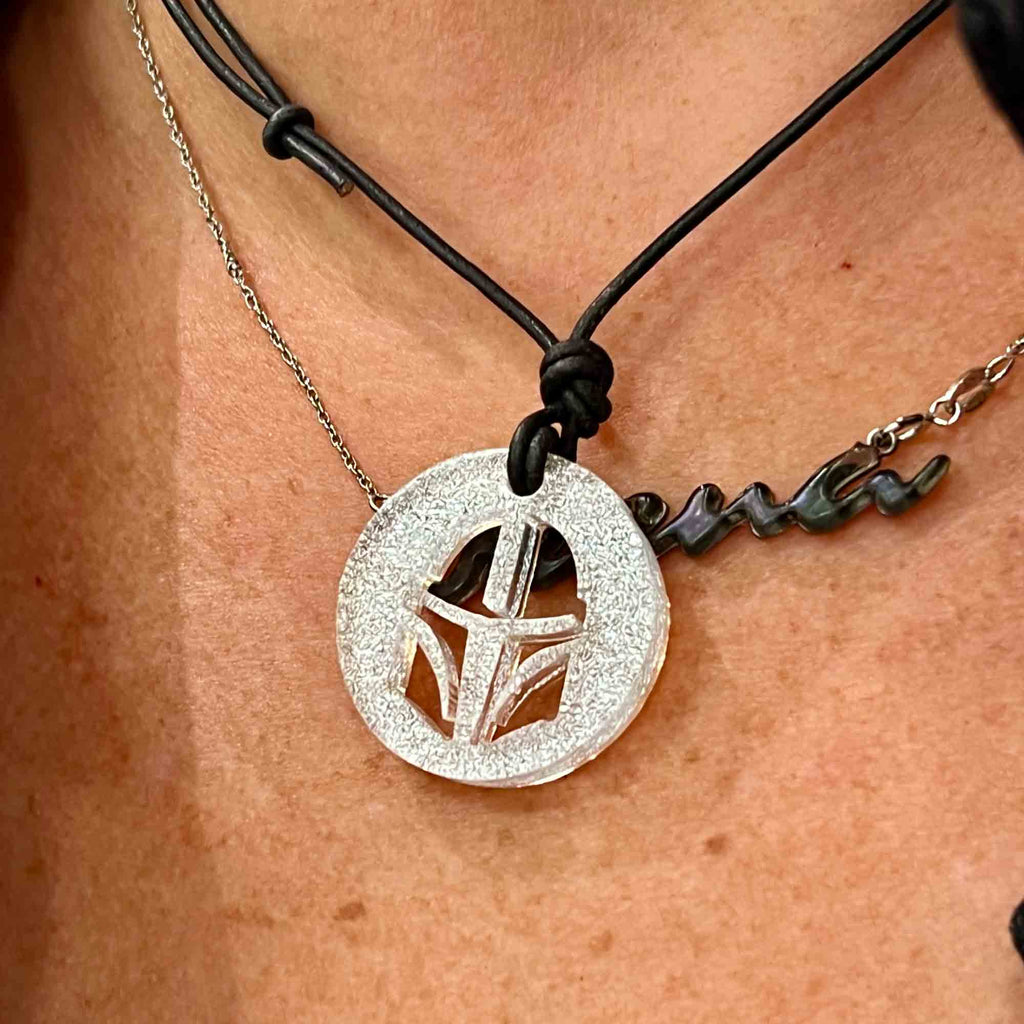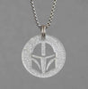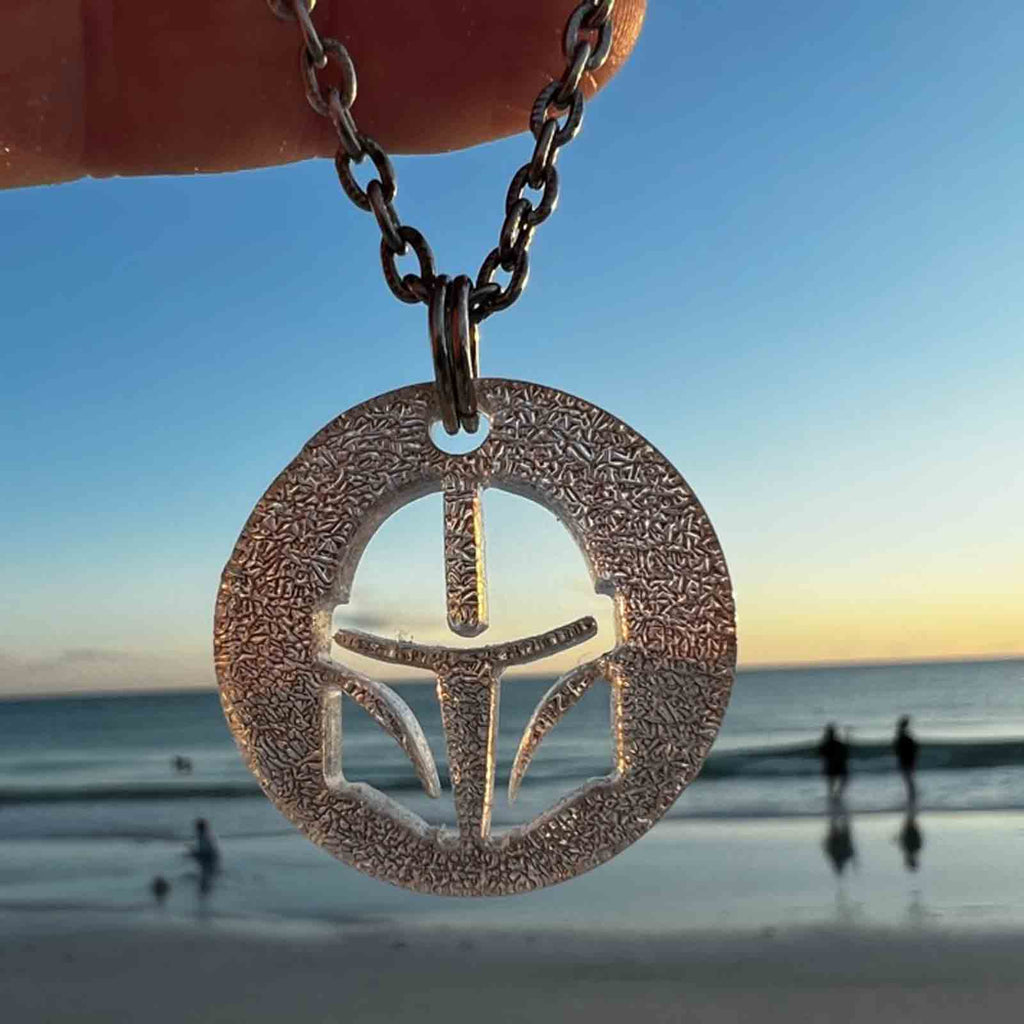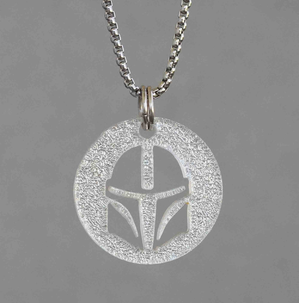 The Mandalorian helmet silhouette fan art design, made of silver color dichroic glass with a stainless steel backing, is a decorative item that features the shape of the iconic helmet worn by Din Djarin, the titular character in the Star Wars series "The Mandalorian." The helmet is made of dichroic glass, a type of glass with a metallic coating that causes it to appear to change color when viewed at different angles. The silver color likely gives it a sleek, shiny appearance. The glass is mounted on a stainless steel backing which could give the product a sturdy and firm finish.