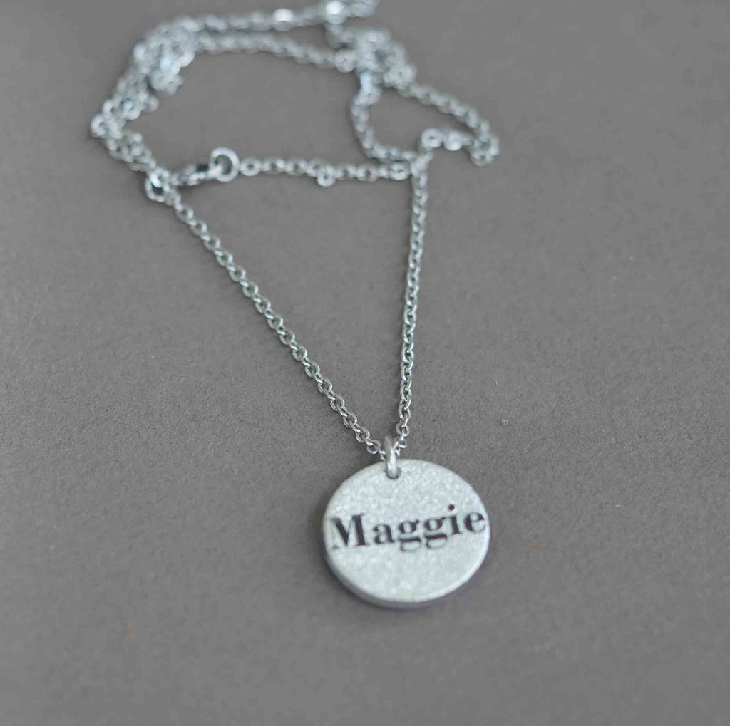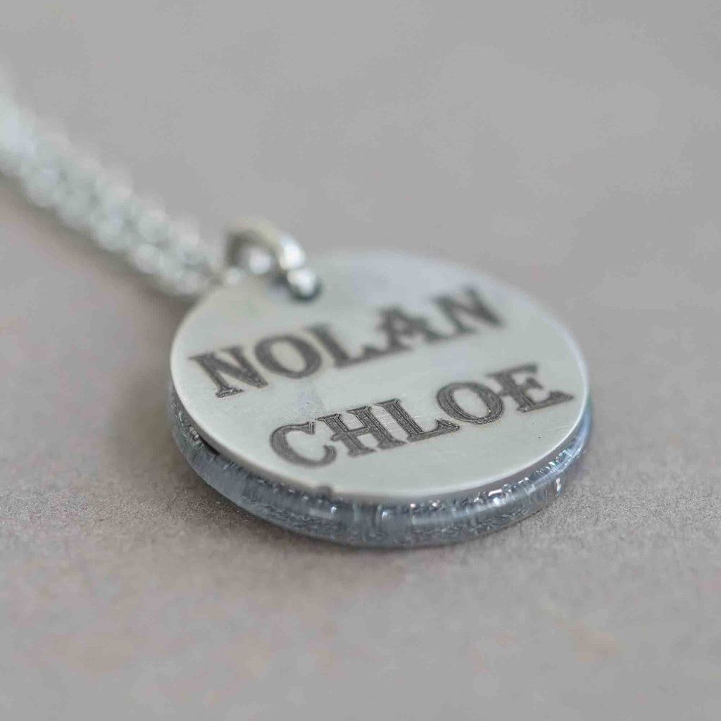 The necklace is made of high-quality etched fused dichroic glass, which is a type of glass that reflects different colors of light depending on the angle at which it is viewed. The name is etched into the glass in a delicate font. We design and make in our studio also a stainless steel bail that is glued to the glass-etched pendant that gives it more strength, and we can etch more on the back with our laser etch tool. The necklace is finished with a stainless steel cable chain and clasp. This necklace is available in a variety of colors and fonts, so you can find the perfect one to match your personality or the personality of the person you're giving it to. Order yours today and show your loved ones how much you care!