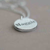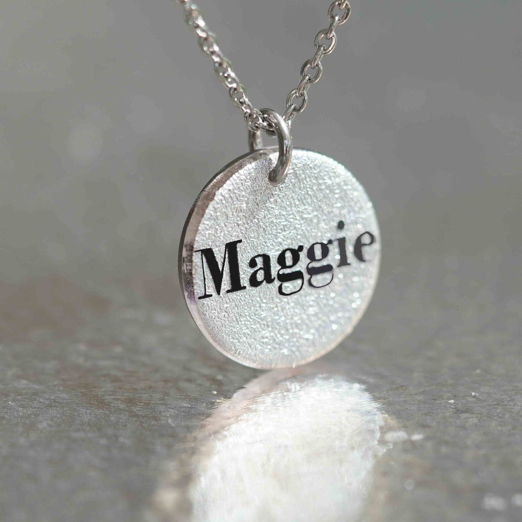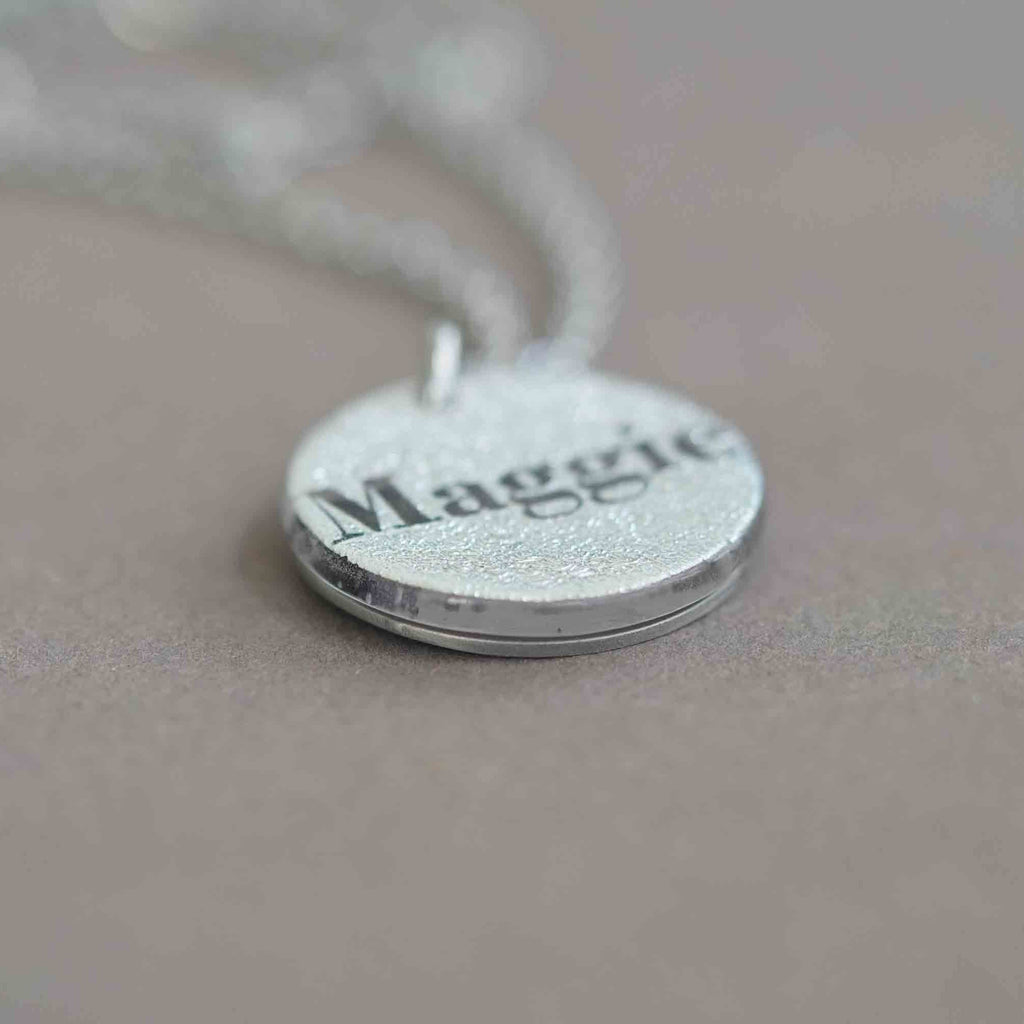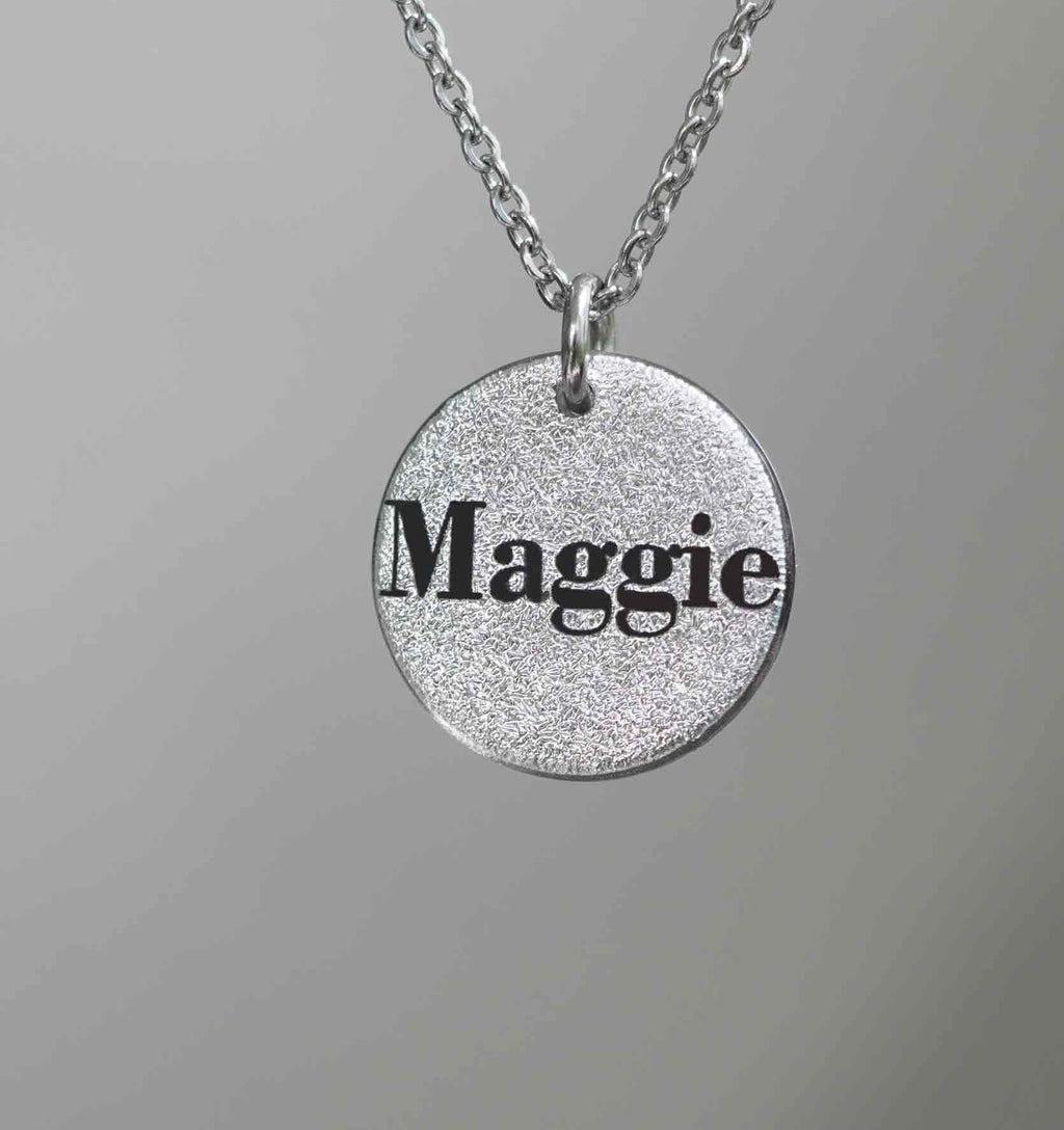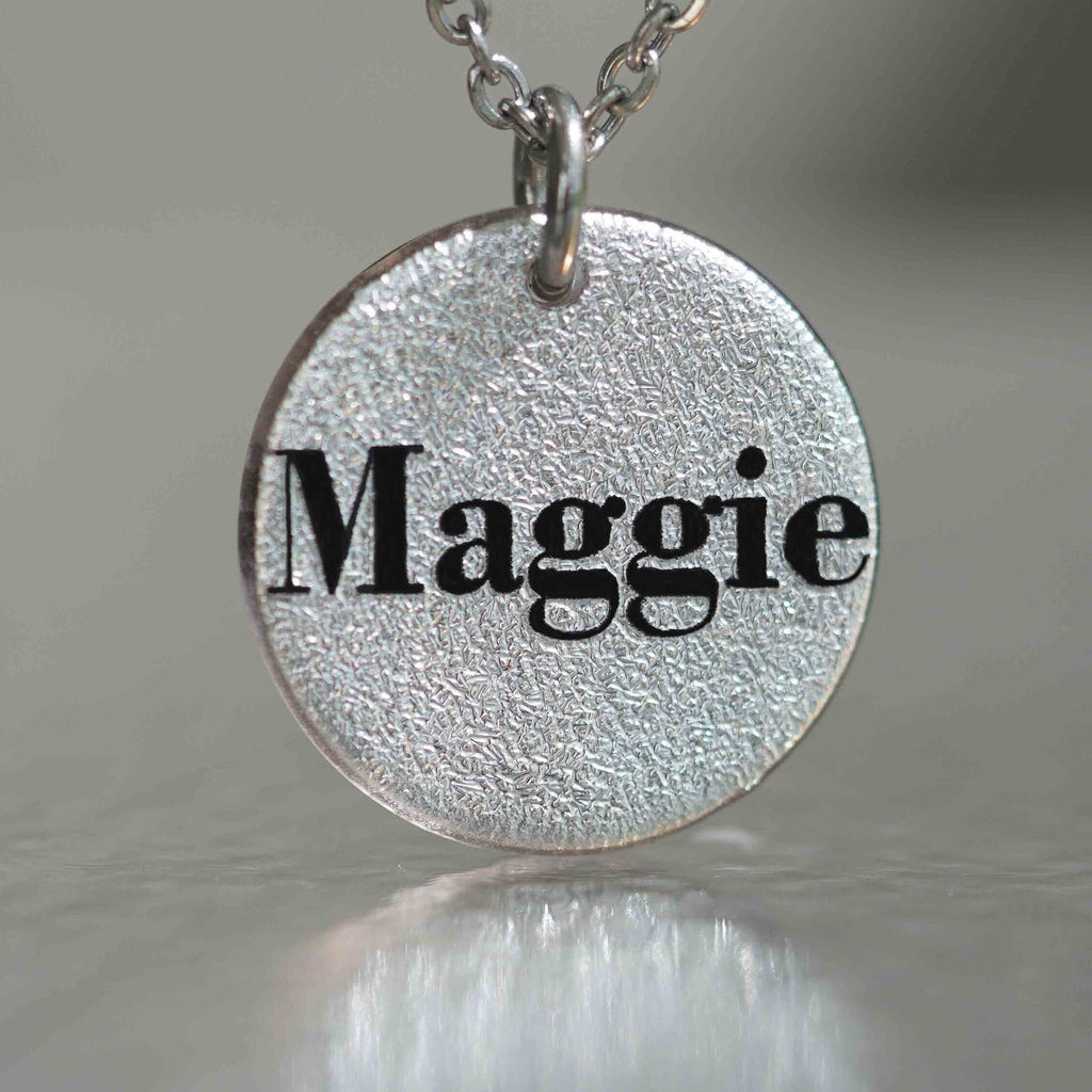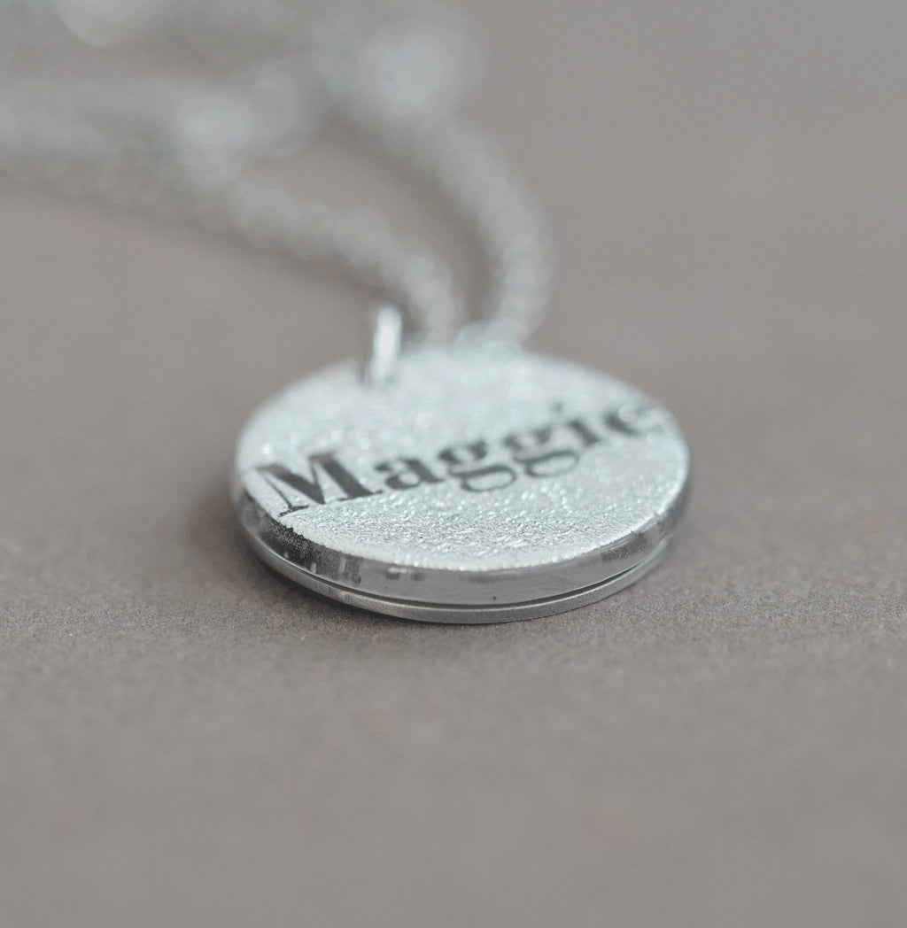 * Size: 0.93 round circle (approx) * Stainless steel backing and bail. * The necklace is made to order, so you can specify the name and font that you want. * Silver color Fused Dichroic glass Made in the USA * Shipping is free * Zulasurfing Studios is Hand-made in Florida.