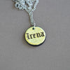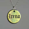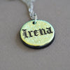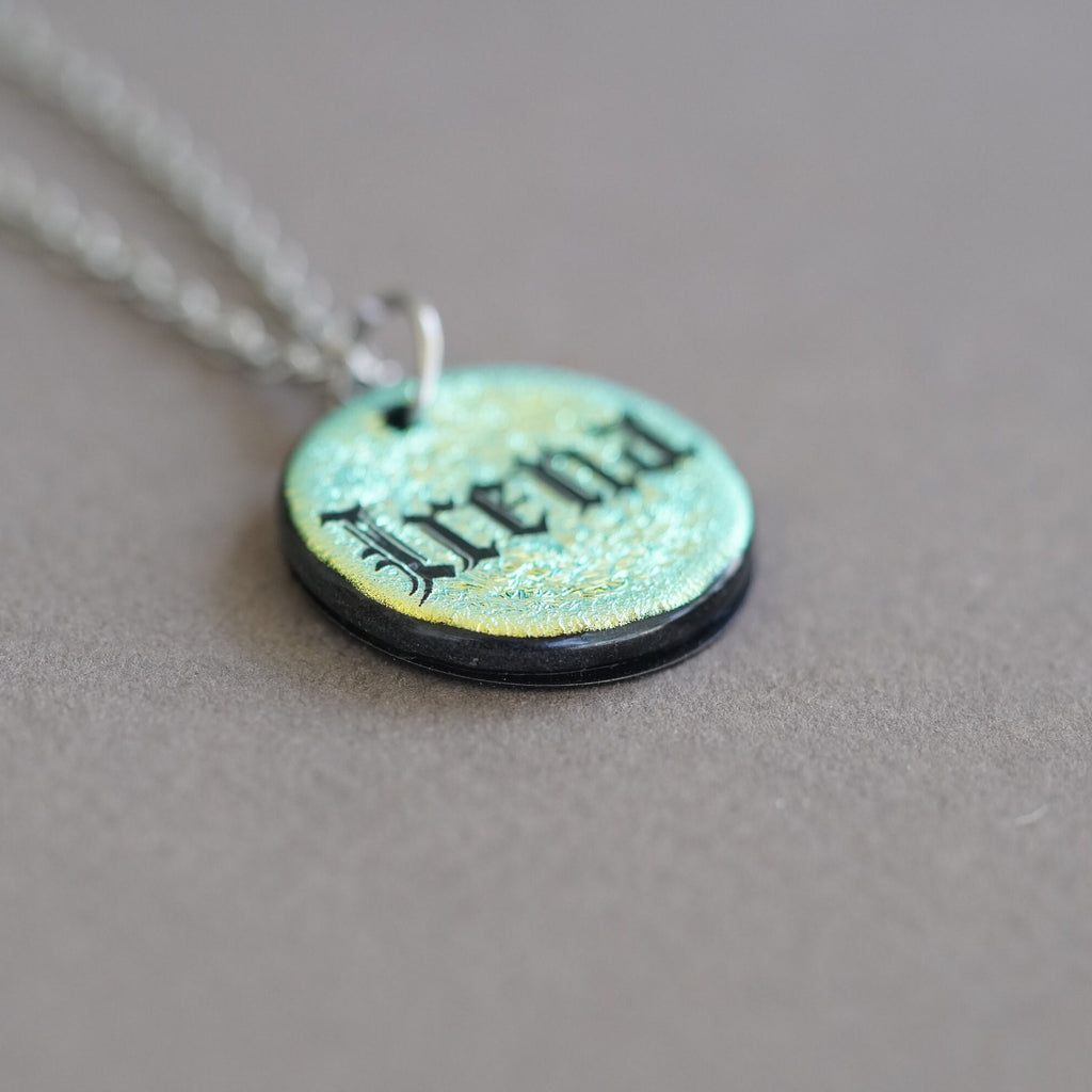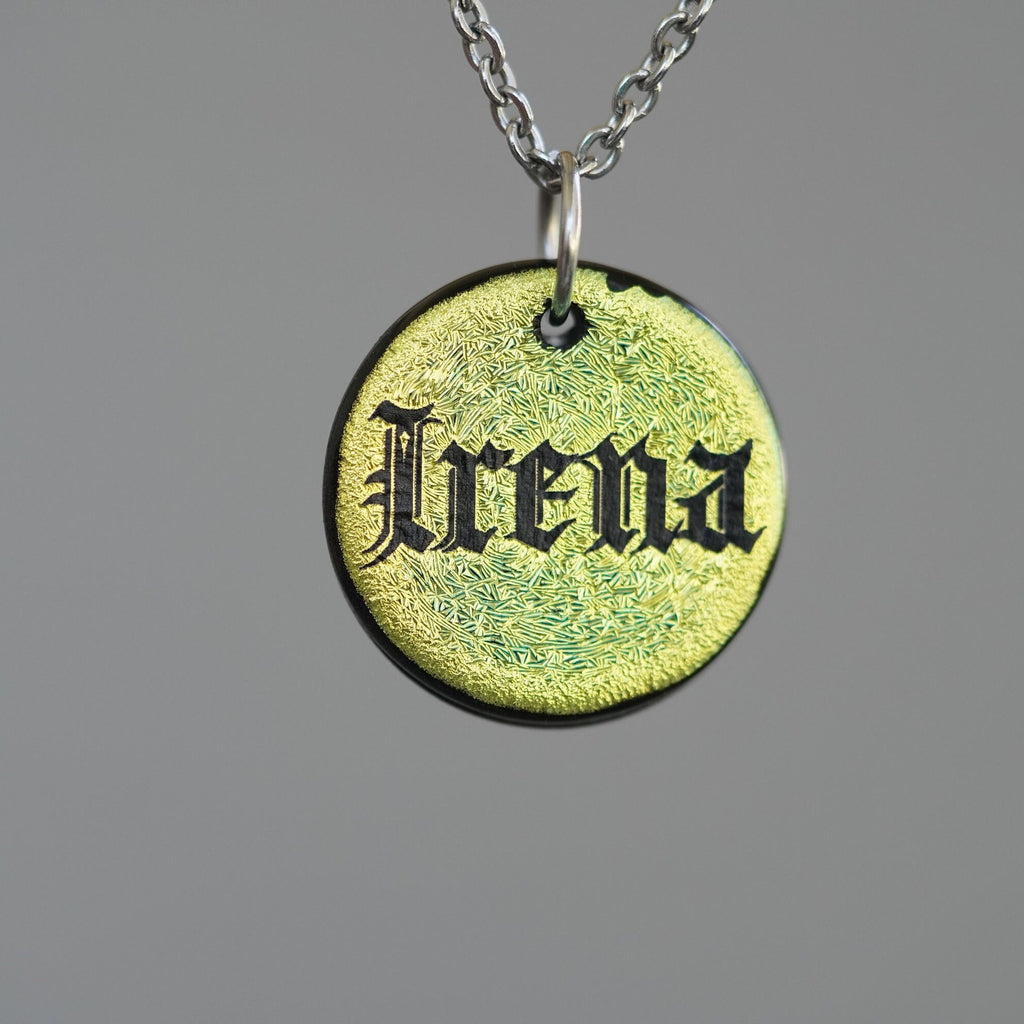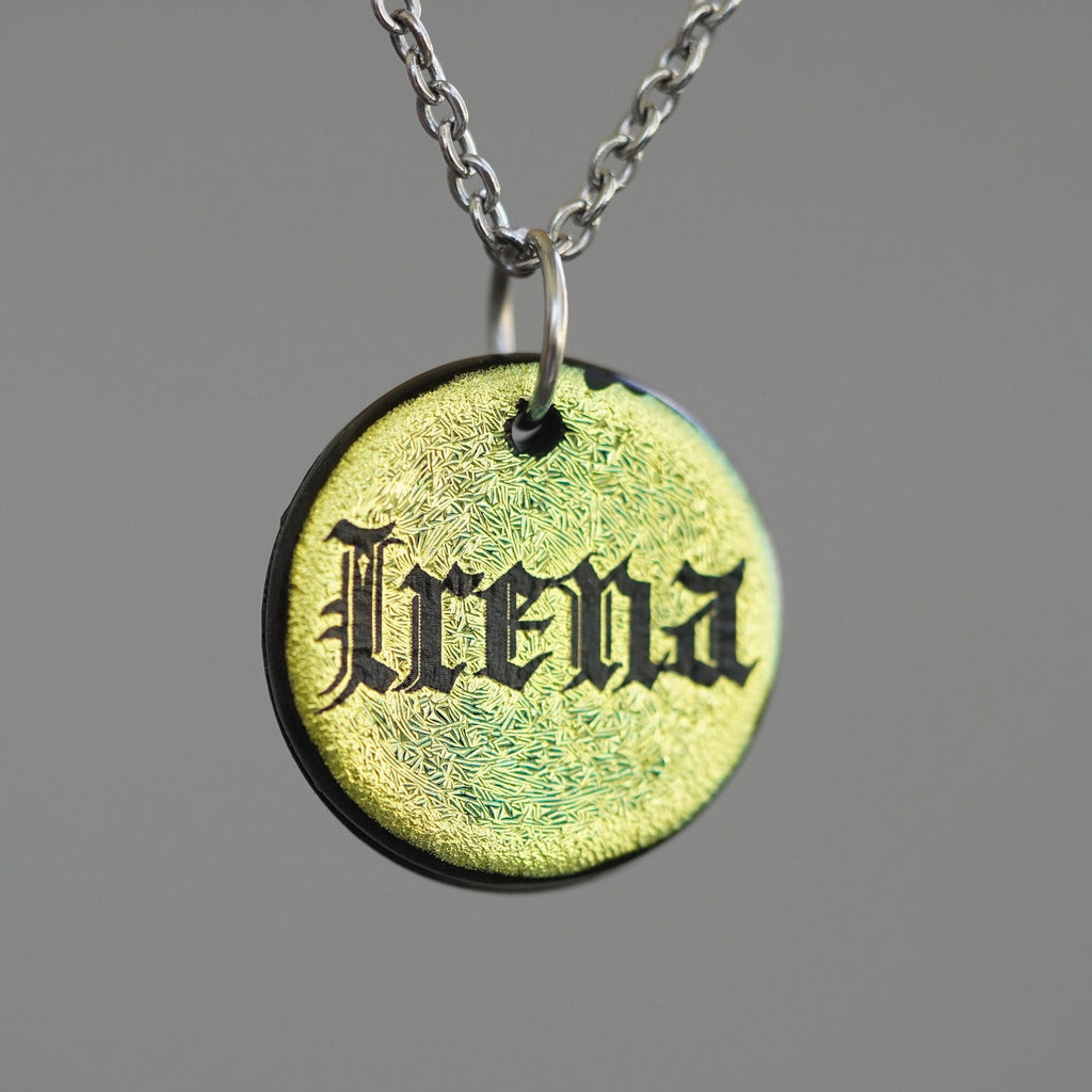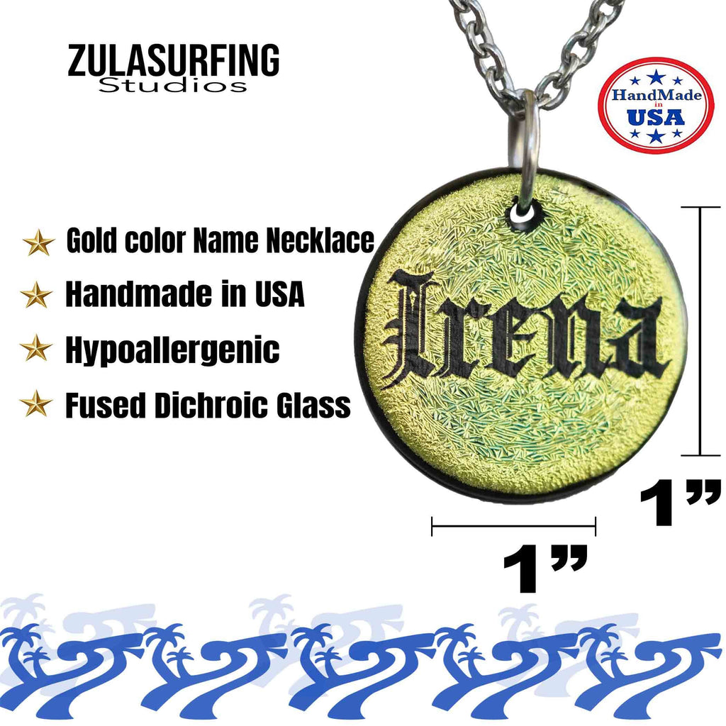 Crafted with care in our Florida-based studio, we introduce to you our special dichroic glass name necklace. Your name is meticulously etched into the dichroic glass, manifesting a brilliant gold color, creating a unique name necklace. This personalized piece of jewelry features a round shape, with the pendant measuring one inch in diameter.